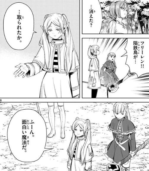 その言葉通り、ラオフェンはまた突然消えてしまい、気付いた時にはフリーレンが持っていた隕鉄鳥が入った籠が無くなっています。隕鉄鳥を奪われてしまいますが、ふーん、面白い魔法だ、とフリーレンは慌てることなくつぶやきます。