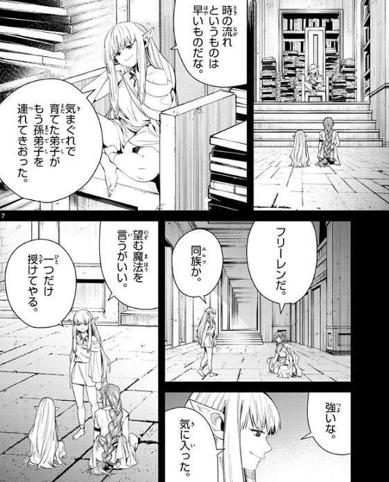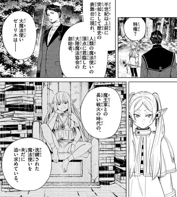 ゼーリエは一級魔法使いの座に就いた者に特権として、一つだけ望んだ魔法を授けると約束した、とリヒターは話します。望んだ魔法が授けられるということは、魔法使いにとって願いが叶うことに等しいことだ、おかげで今や一級魔法使いは人外を疑うほどの化け物ぞろいだ、とリヒターはフリーレンに言います。