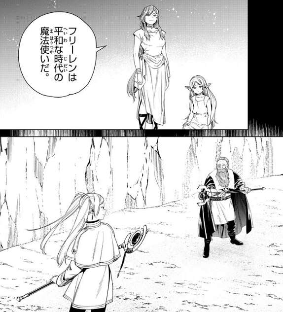 フリーレンは平和な時代の魔法使いだ、とフランメは言い、ここでフリーレンの回想は終わります。デンケンと対峙するフリーレンは、いいね、魔法使いはこうでなくちゃ、とつぶやきます。
