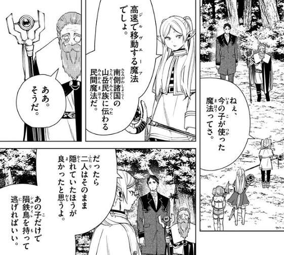 今の子が使った魔法ってさ、高速で移動する魔法(ジルヴエーア)でしょ、南側諸国の山岳民族に伝わる民間魔法だ、とフリーレンはデンケン達に言います。だったら二人はそのまま隠れていた方がよかったと思うよ、とデンケン達は姿を現さない方が良かったとフリーレンは言います。