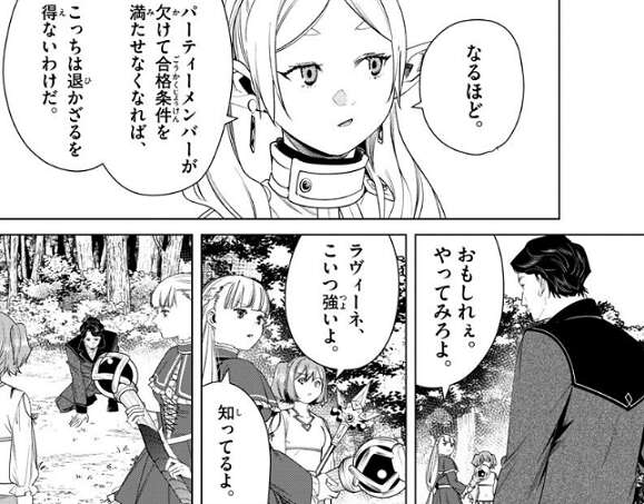 フリーレンはもっと卑怯な手で来るかと思っていた、とデンケン達に言うと、いや十分卑怯さ、とデンケンと同じパーティーのリヒターは言い、俺がそっちのガキ二人どちらかを殺す、とリヒターは言います。それを聞いてラヴィーネは、おもしれぇ、やってみろよ、と挑発しますが、カンネは、こいつ強いよ、とラヴィーネに注意を促します。