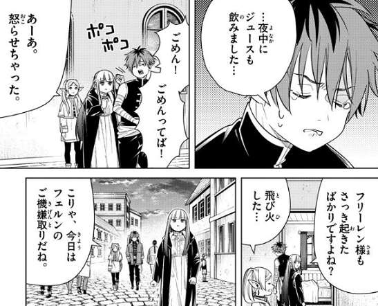 さらに夜中にジュースも飲んでいたとシュタルクは告白すると、フェルンにシュタルクをポコポコと殴って怒ります。さらにフリーレンにも怒りは飛び火し、フリーレンもさっきまで寝ていた事を責めます。今日は一日フェルンのご機嫌取りだね、とフリーレンは美味しい物を食べに行こうと、シュタルクに言います。80年以上前ですが、ヒンメル達と来た時にいい店を見つけていたそうです。