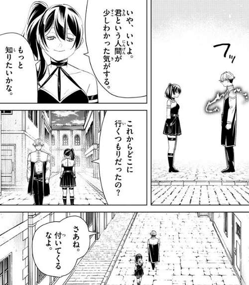 ユーベルはラントに、君は何を思ってどんな人生を歩んできたの?教えてよ?と、聞きますが、ラントは頭の足りない子は嫌いなんだよね、と答えるのを拒否します。ラントは、別に僕を殺したっていいよ、そんなことしたら二度と共感は出来ないと思うけど、と冷静に言うと、君と言う人間が少しわかった気がする、と言いユーベルは見た者を拘束する魔法(ソルガニール)を解除します。ラントはユーベルに、付いてくるなよ、と言い飯屋へと向かいます。