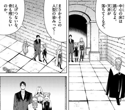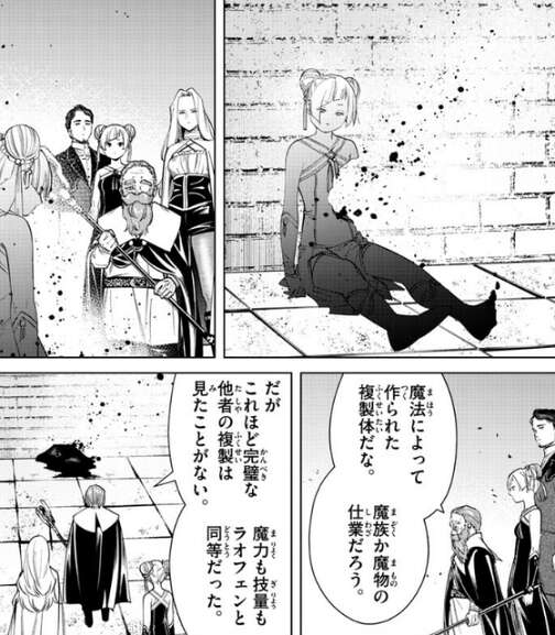 一方、デンケンのチームはラオフェンに似た者に襲われましたが、既に倒しています。デンケンは、魔法によって作られた複製体だと言い、魔族か魔物の仕業だろうと推測します。この複製体は姿だけでなく魔力も技量もラオフェンに似せていて、記憶さえも利用している可能性がある、とデンケンは言います。救いがあるとすれば一目見て偽物だと分かるところだな、とリヒターは言いますが、複数の複製体を同時に操れるとしたら、恐ろしいほどの脅威になりますね、と別の仲間が言います。デンケンは、徒党を組んでいて正解だった、対処できる手段も増える、と言うと迷宮を進んでいきます。
