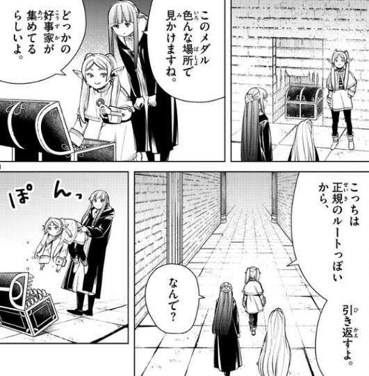 迷宮を進んだ先にガーゴイルが設置されていますが、ガーゴイルが動き出す前に倒し、宝箱からメダルを入手します。このメダルは色んな場所で見かけているようですが、どっかの好事家が集めているらしいです。フリーレンは正規のルートだと分かっているのに、わざわざ引き返し、正規のルート以外も進もうとします。これは、前回ヒンメルが言っていたように、全てのルートを踏破してから次に進むべき、という考え方をフリーレンも実践しているのだと思います。しかし別のルートを進んだ先でも、フリーレンはミミックに引っかかってしまいます。