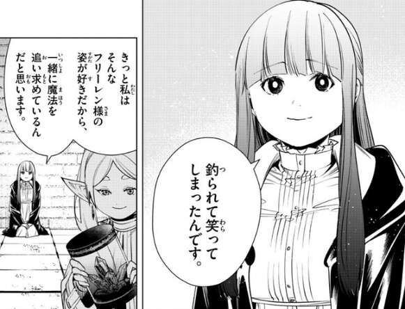 フェルンはそんなフリーレンを見て、釣られて笑ってしまったと話します。フェルンは、そんなフリーレンの姿が好きだから、一緒に魔法を追い求めているんだと思います、と魔法の探求を続ける理由をゼンゼに話します。それを聞いてゼンゼは、君たちに付いてきて正解だったようだ、きっと君達ならこの過酷な迷宮も楽しむことができる、と言います。