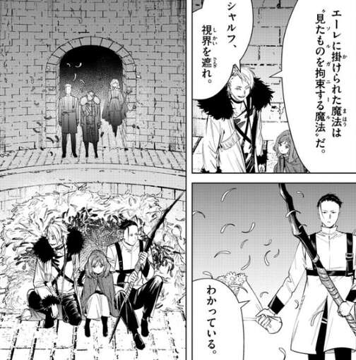 一方、ヴィアベルのチームも迷宮の攻略を進めていますが、エーレが突然魔法によって拘束されてしまいます。エーレは魔力を消した魔法使い三人に奇襲されていると、ヴィアベルに言います。その後すぐに魔法で攻撃されますが、ヴィアベルも魔法で攻撃を防ぎます。エーレに掛けられた魔法は、見たものを拘束する魔法(ソルガニール)で、何故かヴィアベルの魔法で攻撃されています。ヴィアベルはシャルフに視界を遮るように指示します。