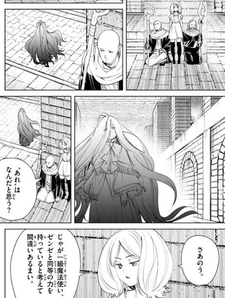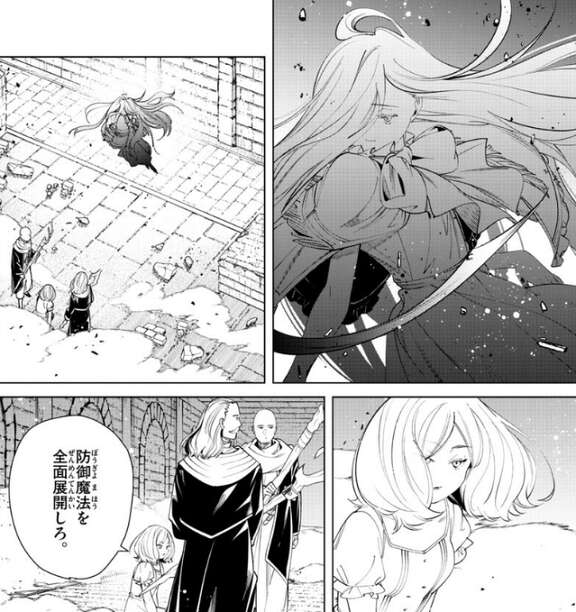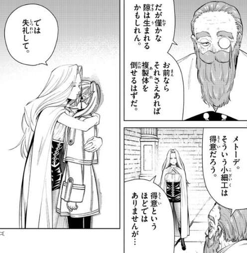 フリーレン達はフリーレンの複製体をどうやって倒すか、弱点を探ります。格上の魔法使いを倒すとしたら、拘束魔法か、精神操作魔法だ、とリヒターは言いますが、フリーレンは拘束魔法と精神操作魔法のどちらにも耐性があると言います。僅かな隙が生まれるかもしれないとデンケンは言い、そういう小細工は得意だろう、とメトーデに言うと、メトーデはフリーレンに抱き着いて何かを調べ始めます。