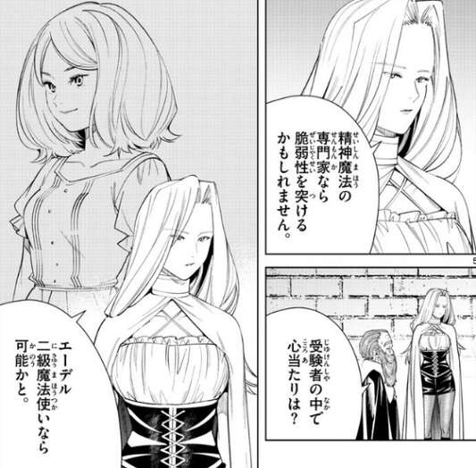 しかしメトーデは、フリーレンの精神防御はだいぶ古い術式だから、精神魔法の専門家なら脆弱性を突けるかもしれません、と言います。心当たりのある受験生としてエーデル二級魔法使いの名前を出しますが、エーデルは戦闘能力が皆無なので正直ここまで来れるかわからない、とメトーデは言います。さらに複製体に“心”がなければ精神操作魔法は通用しません、とメトーデは言います。