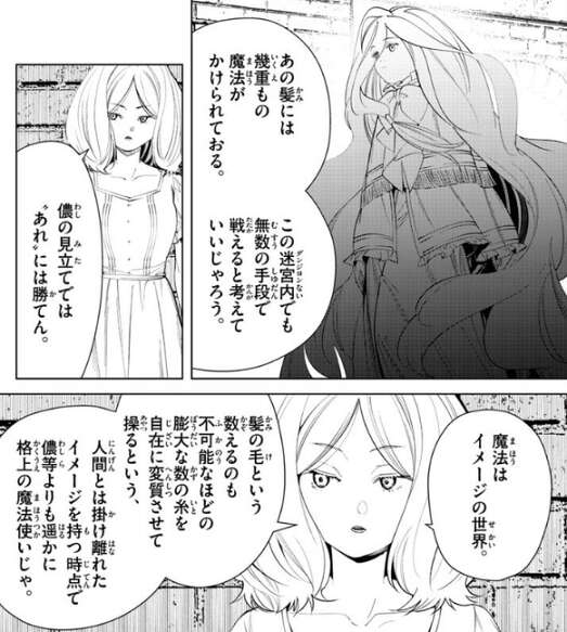 そんな会話をしているとゼンゼの複製体に見つかってしまい、髪を使った攻撃で迷宮の柱を破壊されてしまいます。柱を壊され三人は身を隠すことが出来なくなり、ブライとドゥンストが防御魔法を全面展開しますが、ゼンゼの複製体は髪をいくつも展開して防御魔法を破ろうとします。