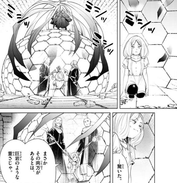 フリーレンやデンケン達はフリーレンの複製体に、未だ手を出せず扉の前で作戦会議中です。精神操作魔法なら隙を作れるかも、という事で精神操作魔法の専門家として、エーデルの名前があがります。しかし、そのエーデルの精神操作でも複製体には通用せず、複製体には心がないという事が判明します。