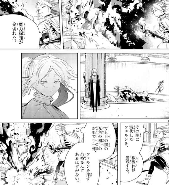 フリーレンとフリーレンの複製体が魔法の撃ち合いをしている間に、フェルンは潜伏して身を隠します。フリーレンの複製体は魔法を使った瞬間、魔力探知が途切れるのでフェルンを見失います。フリーレンの複製体は潜伏したフェルンを警戒しますが、目の前の互角の相手の対処に手一杯で、フェルンを探す余裕がありません。