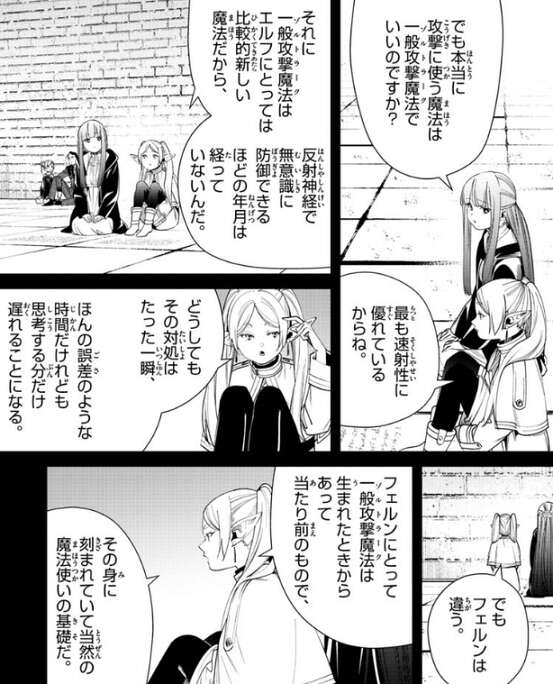 戦闘前の作戦会議でフリーレンはフェルンに、一般攻撃魔法(ゾルトラーク)で複製体を攻撃するように言います。一般攻撃魔法(ゾルトラーク)は最も速射性に優れていて、さらにエルフにとっては比較的新しい魔法だから、反射神経で無意識に防御できるほどの年月は経っていないんだ、とフリーレンはフェルンにアドバイスします。そして、フェルンにとってはエルフと違って一般攻撃魔法(ゾルトラーク)は生まれたときからあって当たり前のもので、その身に刻まれていて当然の魔法使いの基礎だと言い、フェルンの一般攻撃魔法(ゾルトラーク)なら私を殺せる、とフリーレンは断言します。
