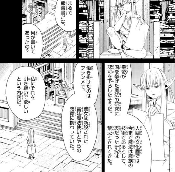 フリーレンが自分の複製と戦っている最中、昔の記憶が蘇ります。フリーレンがゼーリエと再び会った時の記憶で、フランメは既に亡くなっています。フリーレンはフランメの遺言状をゼーリエに届けに来ました。フランメの遺言状には、大陸最大の統一帝国の皇帝が国を挙げて魔法の研究の認可を下したことが書かれているようです。それまで人間の文化圏では、今まで魔法は魔族の技術であるとして、表だった研究は禁忌とされていたようです。さらにフランメは新設された宮廷魔法使いの教育に携わっていたようで、それをゼーリエに引き継いで欲しいと、遺言状に書いています。