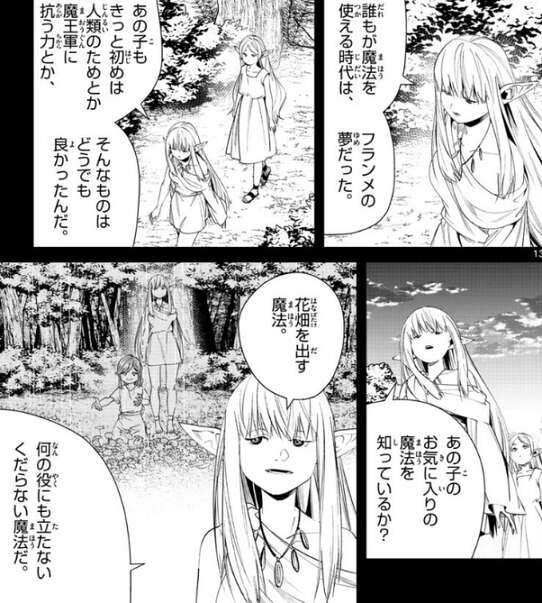フリーレンは、それでもフランメはゼーリエに夢が叶ったことを、伝えておきたかったんだって、と言うと、多分もう会うこともないと思うと言い、フリーレンはその場を去ろうとします。するとゼーリエはフリーレンを呼び止めて、少し歩こうと散歩に誘います。散歩ではゼーリエはフランメの事を話し、フランメのお気に入りの魔法は花畑を出す魔法で、何の役にも立たないくだらない魔法だ、とフリーレンに言います。