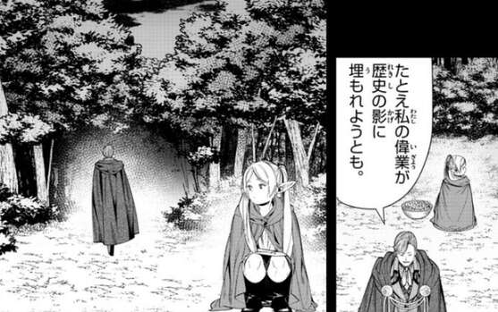 たとえ私の偉業が歴史の影に埋もれようとも、と南の勇者は続けて言うと、フリーレンがいる森を去っていきます。その後、フリーレンのいる森にヒンメル、ハイター、アイゼンが訪れてきて、フリーレンを旅に誘います。