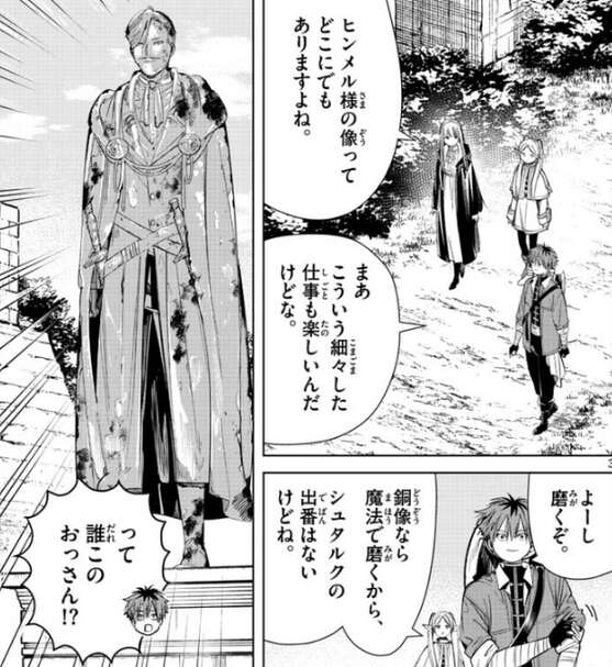 しかし、シュタルクが勇者様の像を磨こうと銅像の前まで行くと、そこにはヒンメルとは別人の像がありました。シュタルクが、って誰このおっさん!?と、驚いていると、南の勇者だよ、とフリーレンが教えてくれます。魔王を倒したのはヒンメルですが、勇者は一人でなく色々な勇者が魔王討伐に挑んだ、とフリーレンは教えてくれます。