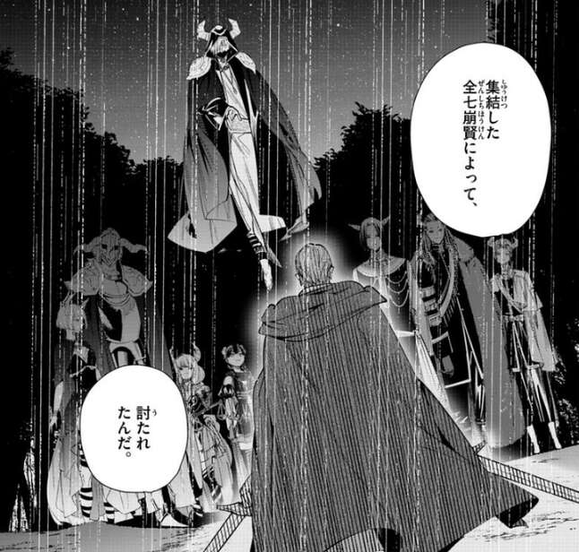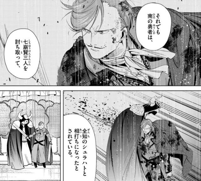 七崩賢には断頭台のアウラなどがいましたが、今回新たに七崩賢以外にも、魔王の腹心・全知のシュラハトという魔族がいた事が判明します。全知のシュラハトは千年後の未来を見通す魔法を操っていたそうですが、倒したのはヒンメルではなく、南の勇者ということがさらに分かります。今回の回想を見る限りだと、南の勇者はパーティーを組まず、一人で全知のシュラハトと七崩賢三人を倒しているように見えます。もしそうなら、確かに人類最強に相応しい勇者と言えそうです。