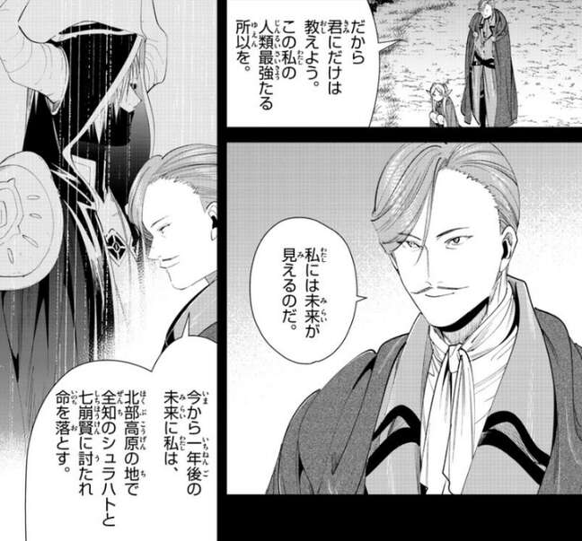 南の勇者は少し考えた後、…君には言っても問題ないな、と言うと、自分の魔法の秘密をフリーレンに話し始めます。南の勇者が人類最強たる所以は、未来が見えるからだと言い、今から一年後の未来には、北部高原の地で全知のシュラハトと七崩賢に討たれ命を落とす、という未来まで南の勇者はフリーレンに話します。