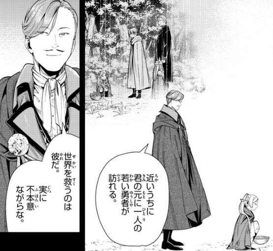 志半ばで私は死ぬが気に病む必要はない、仮にフリーレンが付いてきたとしても私の師という未来自体は変わらない、と南の勇者は言います。そして、近いうちに君の元に一人の若い勇者が訪れる、世界を救うのは彼だ、実に不本意ながら、と南の勇者はヒンメルが訪れる未来のこともフリーレンに教えます。そして、フリーレンがその青年達と共に旅に出て魔王を倒す、とも言いますが、フリーレンは信じようとしません。しかし南の勇者は、彼がフリーレンの人生を変えると断言します。