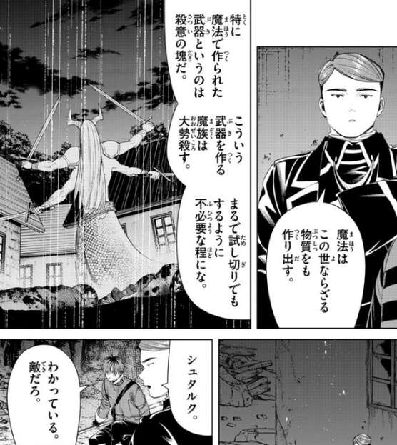 村に残ったシュタルクは夜、魚を釣ってきてゲナウに進めます。しかし、夜食は不健康だとメトーデに怒られる、とゲナウは言い魚は食べません。シュタルクは夜食を食べますが、フェルンには言わないでね、とゲナウにお願いし、ゲナウも言わないと約束します。シュタルクはゲナウに村を襲った魔族に心当たりがあるんだろう、と聞くと四刀流の魔族は神技のレヴォルテという名前で、ゲナウの相棒を殺した魔族だとシュタルクに答えます。神技のレヴォルテは魔法で作り上げた四本の剣を自在に操り、剣の重さも自在に変えられるそうです。