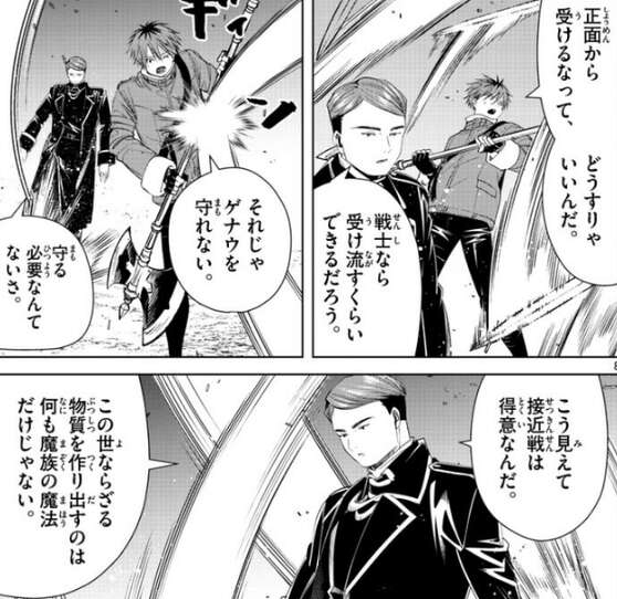 シュタルクはレヴォルテの剣技を受け流すだけで精一杯で、ゲナウを守る余裕がなくゲナウの心配をしますが、接近戦は得意だとゲナウは言うと、黒金の翼を操る魔法(デイガドナハト)という魔法を使ってレヴォルテの剣を防ぎます。シュタルクの斧とゲナウの黒金の翼を操る魔法でレヴォルテの剣技を受け流しますが、レヴォルテの剣の手数も反射速度も人間とは桁違いで徐々に押され始めます。そして、とうとうシュタルクはレヴォルテの一撃を正面から受けてしまいます。
