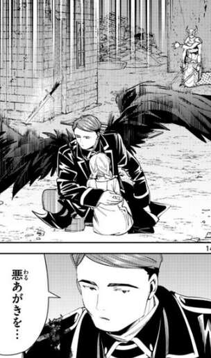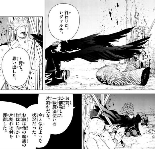 しかし、シュタルクはレヴォルテの一撃はわざと受けて斬られてようで、ゲナウはレヴォルテの隙をついて黒金の翼を操る魔法で攻撃し、レヴォルテに重傷を負わせ追い詰めることに成功します。しかし、レヴォルテはゲナウの事を思い出し、以前村を襲った時のことを話し始めます。