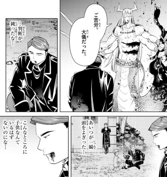 ゲナウが助けようとしたのは子供ではなく、72話で出てきたレヴォルテの部下の魔族で、魔族は元の姿に戻るとレヴォルテに褒めて…、と話しかけます。しかし魔族が話している途中で、ゲナウは黒金の翼を操る魔法で魔族の体を真っ二つにし、魔族を殺します。レヴォルテは部下の家族が殺されても特に気にせず、ご苦労、大儀だった、と言うだけでゲナウに再び向き合います。ゲナウは死んだ相棒の事が一瞬、頭をよぎったようで、判断が鈍ったな…、と心の中でつぶやきます。