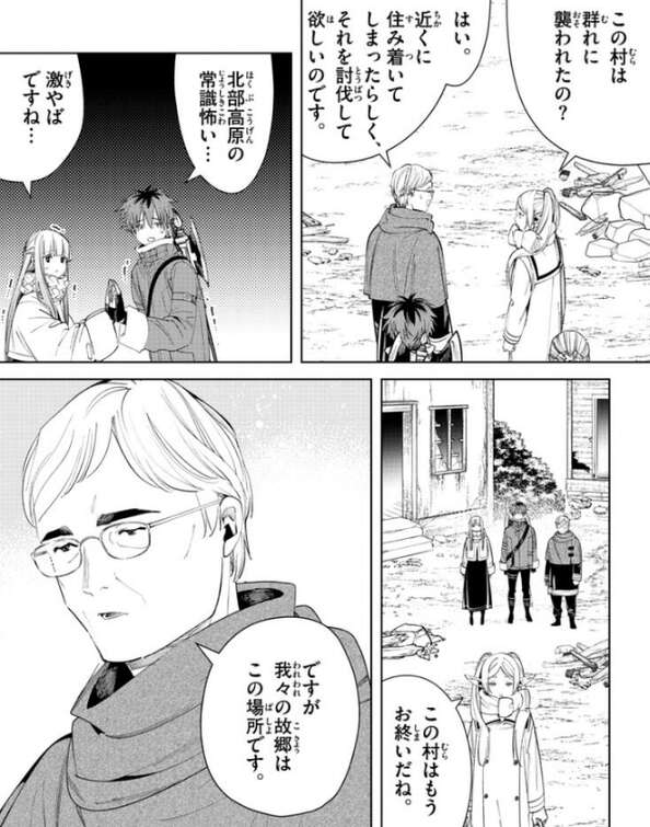 しかし村人が、竜っていったら普通は群れではないのですか?と、当たり前のように言うと、二人は北部高原の常識にさらに怯えます。竜の群れは村の近くに住み着いてしまったようで、村人はフリーレンに竜の群れの討伐を依頼します。しかし、フリーレンは別の場所に移り住んだ方がいいと言いますが、村人は我々の故郷はこの場所です、と言い移り住む気はないようです。