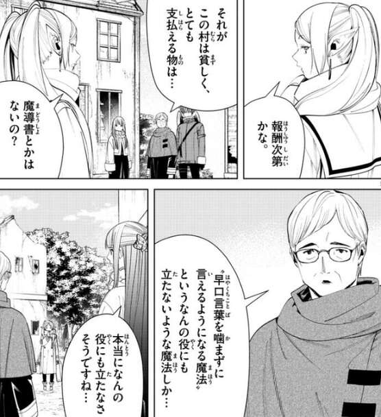 フェルンとシュタルクが村の人が可哀想と言うと、フリーレンは討伐の報酬次第だと言いますが、この村は貧しく討伐の報酬として支払える物はないようです。フリーレンが魔導書とかはないの?と聞くと、“早口言葉を噛まずに言えるようになる魔法”という何の役にも立たないような魔法しか…、と村人は答えますが、本当になんの役にも立たなそうですね…、とそれを聞いたフェルンはあきれたように言います。