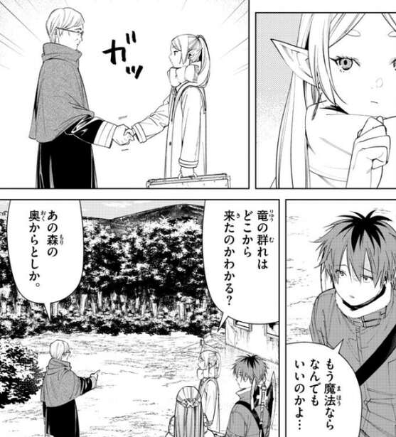 しかし、フリーレンはその魔導書が欲しかったようで村人とがっちり握手をして、討伐依頼を引き受けます。シュタルクが、もう魔法ならなんでもいいのかよ…、とあきれたように答えますが、フリーレンはシュタルクの言葉は無視して竜の群れがどこから来たかを聞くと、魔力の痕跡を追跡して竜の群れの討伐に向かいます。