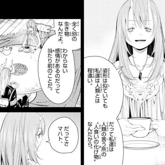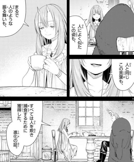 ソリテールはマハトに、私達には一生分からない感情だよ、と答え、魔族の姿も言葉も振る舞いもすべては人を欺き捕食するために獲得した、進化の証だと断言します。