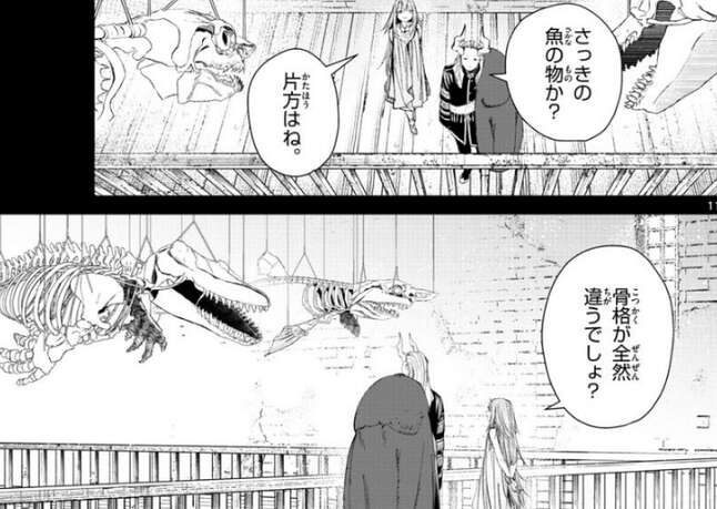 ソリテールは、やっぱり魚に見えるんだ、とマハトに言うと、造船所を再利用して作った小屋にマハトを案内します。小屋には骨格標本があり、イルカと何かの魚の骨格標本がつるされています。