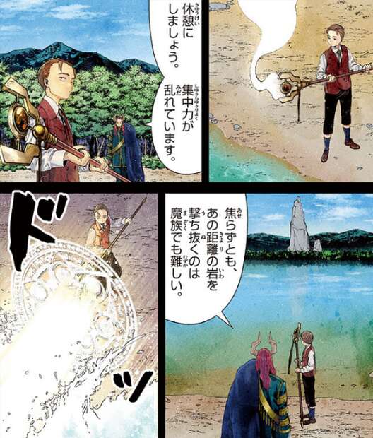 マハトとデンケンは師弟関係となり、マハトがデンケンに魔法を教えています。マハトが、あの距離の岩を撃ち抜くのは魔族でも難しい、と休憩にしようと言いますが、その直後にデンケンは岩を魔法で見事に打ち抜きます。