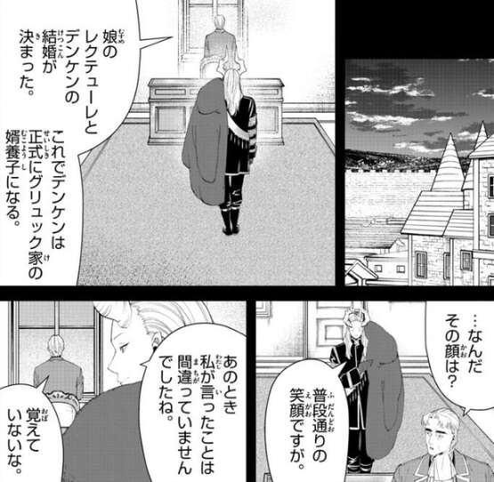 時は流れてデンケンも青年になり、マハトの魔法の指導のおかげで、軍の中で功績をあげたようです。そして、グリュックの娘・レクテューレとデンケンの結婚も決まります。まだデンケンとレクテューレが子供だった頃に、マハトはレクテューレがデンケンを好いているようだと言っていましたが、自分が言っていた事は間違っていませんでしたね、とマハトは主張します。しかし、グリュックはとぼけて誤魔化します。