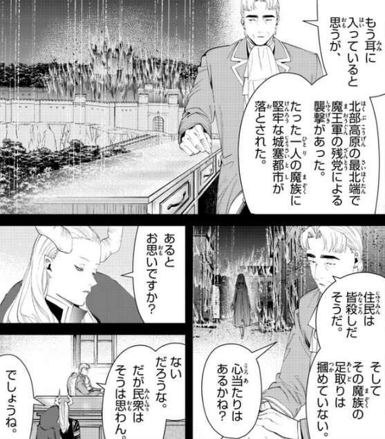 しかしこの頃、北部高原の最北端で一人の魔族が城塞都市を襲撃していて、その城塞都市の住民は皆殺しにあっていました。この魔族の足取りは掴めておらず、グリュックはマハトに魔族に心当たりはないか尋ねますが、マハトはあると思いですか?と、答えます。マハトに心当たりはありませんが、ヴァイゼの民衆はそうは思っていないようで、その世論を味方にしてヴァイゼの貴族達はグリュックに、ある要求をしてきました。