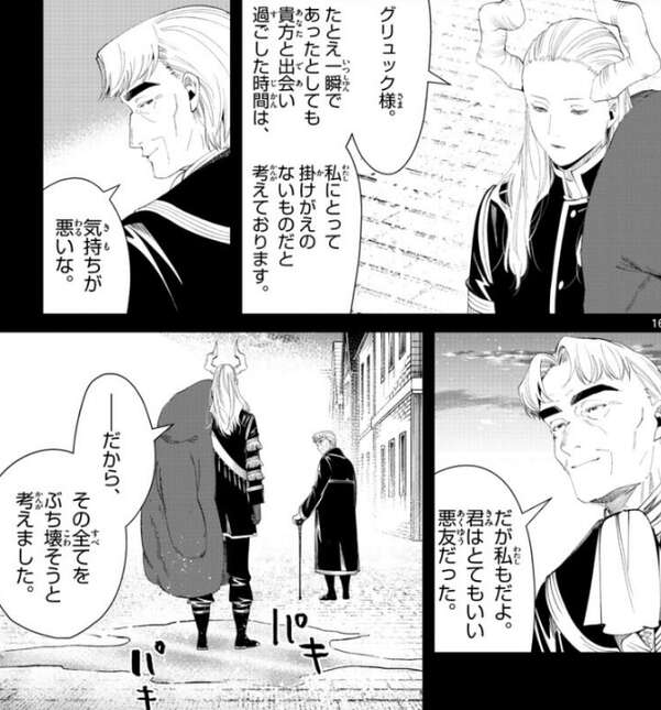 この頃になるとグリュックも年を取ってしまい、立ち上がる時にマハトが手を貸すようになっていました。グリュックはマハトと過ごした時間を振り返り、魔族のマハトにとっては一瞬の出来事に過ぎなかったのだろうな、とマハトに言います。マハトは、たとえ一瞬であったとしても貴方と出会い過ごした時間は、私にとって掛けがえのないものだと考えております、と答えますが、グリュックはそんなマハトに気持ちが悪いな、とつぶやきます。しかし、グリュックはそんなマハトをとてもいい悪友だったとも言いますが、だから、その全てをぶち壊そうと考えました、とマハトは言うと足元の地面を黄金に変え始めます。