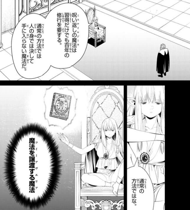 本来、呪い返しの魔法(ミステイルジーラ)は習得だけでも百年の修行を要する魔法のようで、通常の方法では人の身では決して手に入らない魔法だ、とゼーリエは言います。しかしゼーリエは魔法を譲渡する魔法(フイーアヴエリア)という魔法を使い、呪い返しの魔法(ミステイルジーラ)をデンケンに譲り渡します。一級魔法使いの特権の正体は、魔法を譲渡する魔法(フイーアヴエリア)を使ってゼーリエが自らの魔法を切り崩して他者に与える、というものでした。