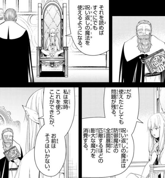ゼーリエが魔法を譲渡する魔法(フイーアヴエリア)で作り出した本を読めば、すぐにでも呪い返しの魔法(ミステイルジーラ)を使えるようになるようですが、呪い返しの魔法(ミステイルジーラ)は防御魔法の全面展開に匹敵するほどの、膨大な魔力を消費するという問題もあります。ゼーリエなら常時使うことが出来るようですが、デンケンでは呪いという不可視の魔法をピンポイントで防ぐ必要があり、ゼーリエはデンケンにどう対処するつもりだ?と、質問します。