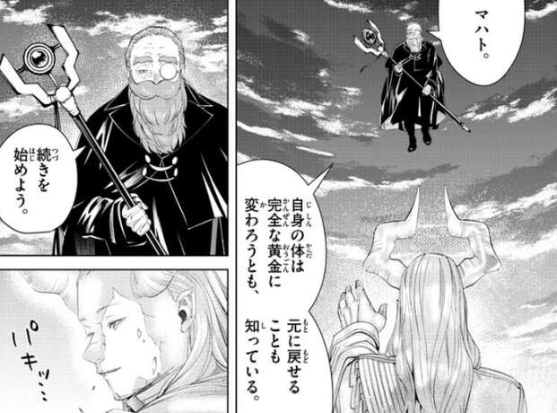 しかし、デンケンは師であるマハトが魔法を使う瞬間ぐらい分かると言い、…何も問題はない、と答えます。回想は終わりデンケンとマハトの戦闘の場面に戻り、デンケンは黄金に変わったマハトに、自身の体は完全に黄金に変わろうとも、元に戻せることも知っている、と話しかけます。そして、続きを始めよう、とデンケンはマハトに言います。