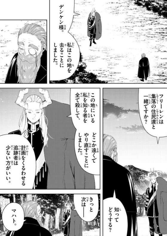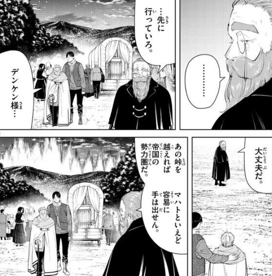 フリーレンと集落の住民たちを連れて避難するデンケンですが、何かに気付いたようで、集落の住民に先に行くよう伝えるとデンケンは一人残ります。フリーレンと集落の住民を先に行かせると、集落の住民は何かを察したのかデンケンに、…ご武運を、と声を掛けます。