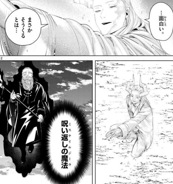 しかしデンケンは呪い返しの魔法(ミステイルジーラ)を使い、マハトに黄金の呪いを跳ね返します。呪い返しの魔法(ミステイルジーラ)とは、第93話で過去にゼーリエがマハトに使った魔法です。