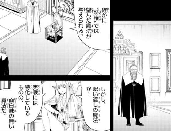 呪い返しの魔法(ミステイルジーラ)を渡すことに、呪いの対抗手段を失ってしまう、とゼンゼはゼーリエに異を唱えますが、ゼンゼは、私を誰だと思っている、呪いへの対策など他にいくらでもある、“特権”は絶対だ、と自分の考えを変えません。それにまた百年かけて学び直せばいいとゼーリエは言い、私にとっては些細なことだ、とゼーリエは呪い返しの魔法(ミステイルジーラ)を失うことを気にしません。