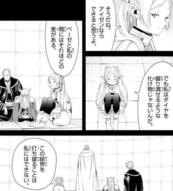 それでもフリーレンは、私はダイヤを握り潰せるような化け物じゃないんだ、ベーゼと私の間にはそれほどの差がある、と言い、不死なるベーゼの結界魔法は打ち破れない、と諦めたままです。するとヒンメルは、だったら僕がイメージさせてやる、この世に不可能はないって、と言うと剣を構え、結界魔法を剣で壊そうとします。