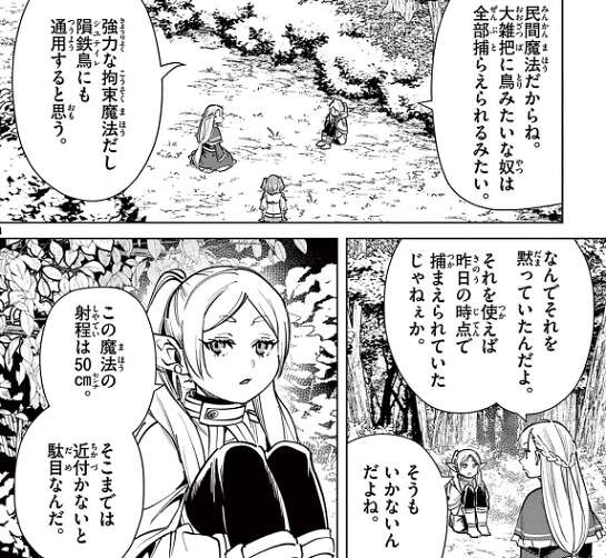 フリーレン達は隕鉄鳥を観察して気付いたことを話し合い、隕鉄鳥を捕まえる作戦を話し合います。フリーレンは“鳥を捕まえる魔法”を使って隕鉄鳥を捕まえようと考えますが、隕鉄鳥は音速を超えて飛行し、隕鉄鳥には魔力探知も出来ません。“鳥を捕まえる魔法”は射程が50cmでそこまで近付かないと駄目ですが、そこまで近付くのは難しそうです。