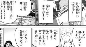 今週から一花から見た学園祭という形で学園祭が振り返られています。第99話で二乃が教室にいるのに広場にいるらしい場面がありましたが、広場にいたのは二乃に変装した一花でした。たぶんこんな感じでいろいろ省略された内容は、今後明らかになっていきそうです。