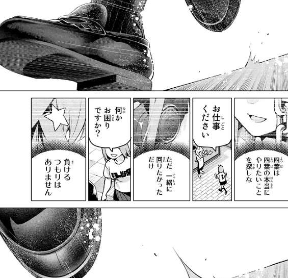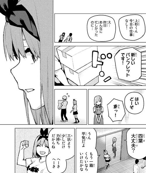 翌日の二日目、四葉は開場の三時間前から出てきてなんでもしますと、さらにお仕事を手伝おうとします。新しいパンフレットを運んだあと少し無理をしているような表情をする四葉ですが、三玖から大丈夫か心配されても、三玖より少しだけ力持ちだからね、へーき へーきと軽口で応えます。