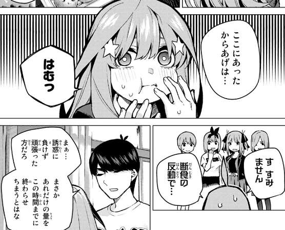 その後、五つ子全員と風太郎が集まり風太郎の告白を聞いた後の場面、五月は今まで我慢していた反動で置いてあったからあげを全部食べてしまい、四人を驚かせます。