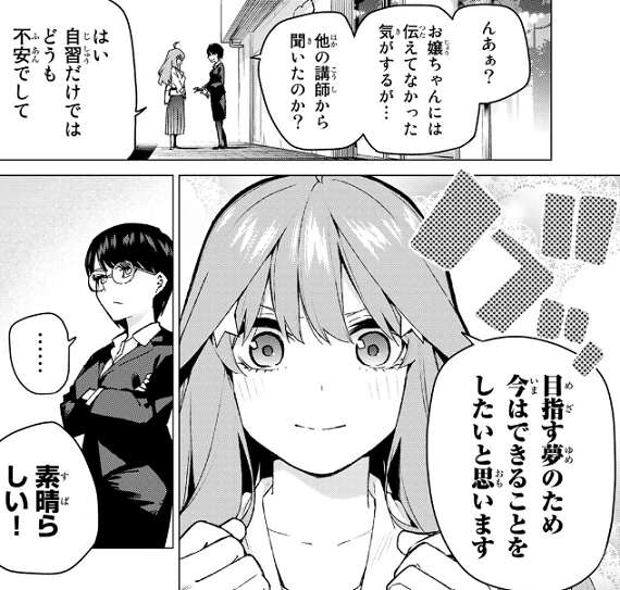 二乃にも心配され二乃は五月に食べ物を奢ろうとしますが、五月は全てを終わらせるまで邪念は断つと食べ物を断ります。五月は教師という夢は分不相応な目標だったのでしょうか、とつい弱気になってしまいますが、二乃からは学校の先生なんて立派な夢だと、五月の夢を応援していると励まされます。二乃は父親に招待状を送った話をし、こういう時に道標になってくれるのが親の役目だと言います。
