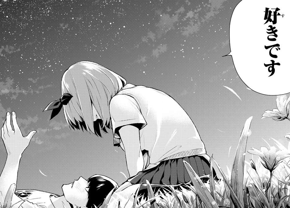 ついに四葉に告白した風太郎ですが、四葉の性格からか最初は他の姉妹の方がいいと言うような事をいって断ってきます。さらに風太郎から逃亡してしまいますが、五月のアドバイスもあり、再度風太郎が告白し四葉も正直な気持ちを告白します。